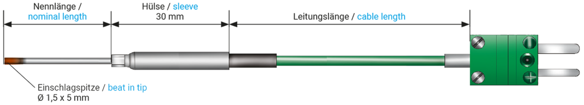 The beat‑in / drive‑in mineral insulated thermocouple with cable is designed for precise surface temperature measurement in industrial and automotive applications. This surface thermocouple can be securely mounted by beating or driving it into a prefabricated groove, ensuring stable and reproducible positioning. The measuring point is located behind the copper tip and is easily identifiable by its color difference.