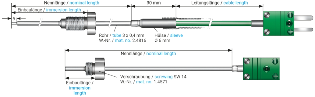| Connection cable | - Thermocouple extension cable 2 x 0,22 mm² (FEP / C / FEP) - Thermocouple extension cable 2 x 0,22 mm² (FEP / FEP) - other connection cables - on request (see technical data) |