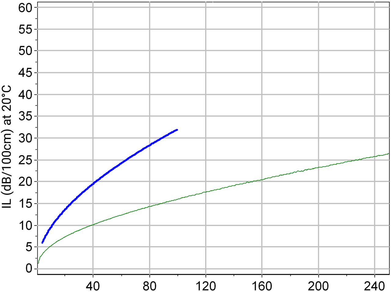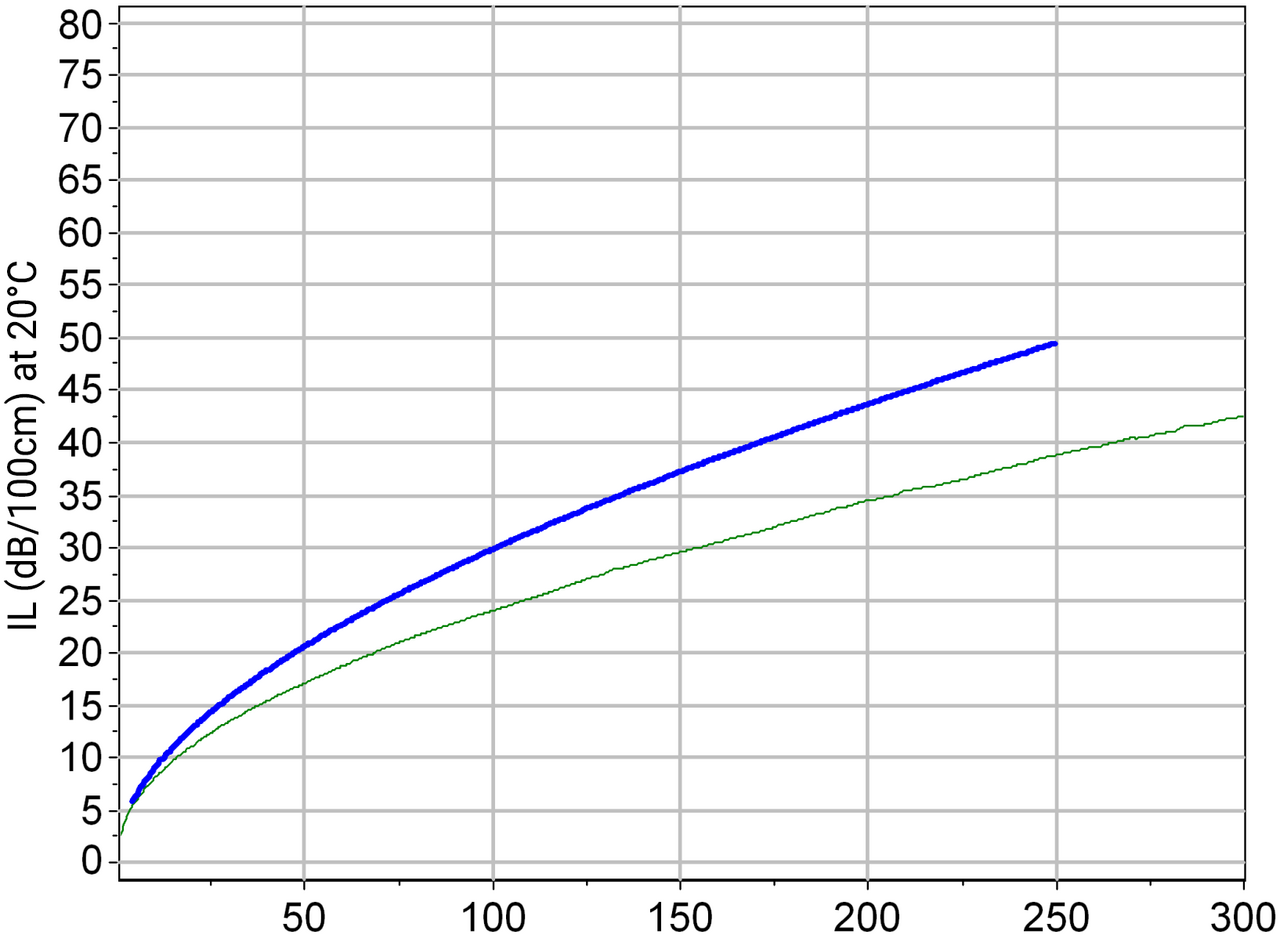 | attenuation | dB/ 100 m | 3,1 | 5,7 | 8,9 | 11,2 | 12,6 | 15,8 | 22,5 | 28,7 | 36,1 | 41,4 | 51,4 | 67,9 |