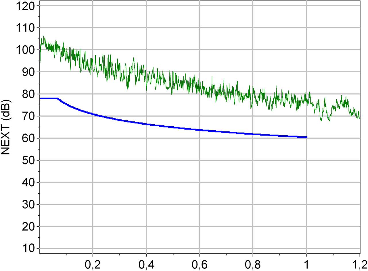 | crosstalk (Next) | dB | 80,0 | 80,0 | 80,0 | 80,8 | 80,8 | 80,0 | 75,5 | 72,4 | 69,6 | 67,9 | 65,3 | 60,8 |