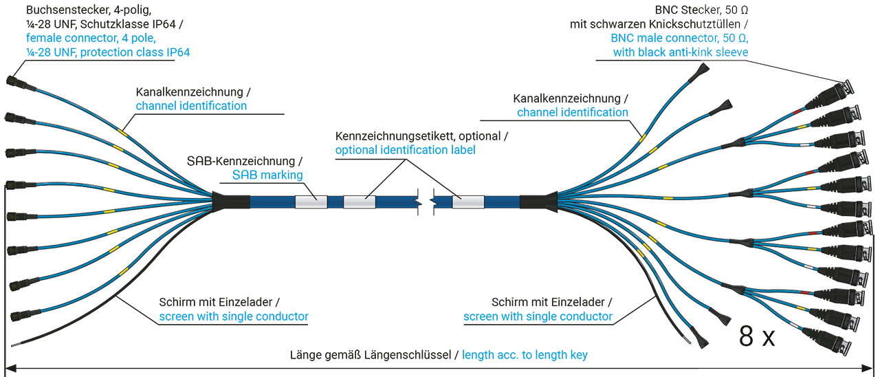 with 8 x female connector ¼-28 UNF, 4-pole and 8 x (3 x BNC connector)