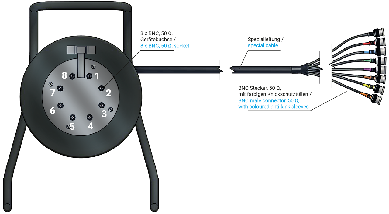 with 8 x BNC installation socket and a wound up 8-fold collection cable with 8 x BNC male connector