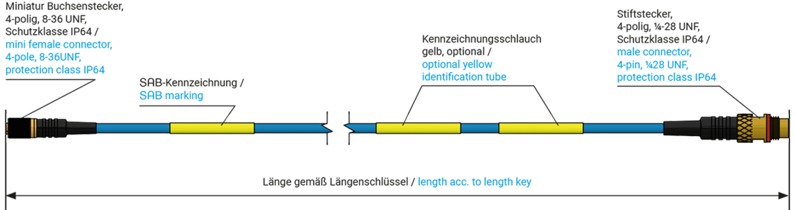 Adapter cable for the adaptation of a mini female acceleration sensor (IEPE) with a 4-pin ¼ 28 sensor cable.