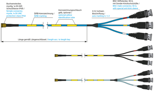 connection cable with waterproof sensor connector IP 68 for triaxial acceleration sensors on IEPE Basis