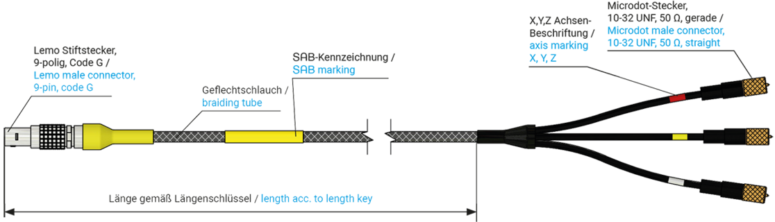 Sensor connection cable for triaxial acceleration sensors with charge output and connection to e.g. Müller BBM PAK Messtechnik