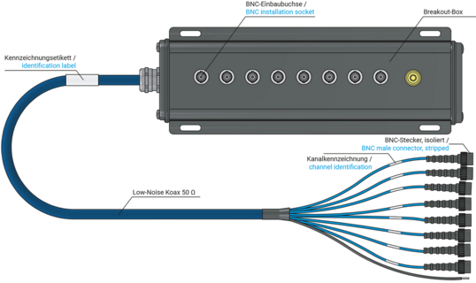Breakout box with BNC multicore cable for structured and proper laying and recording, e.g. on the test bench