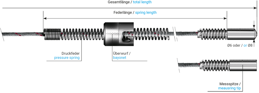 The design of these bayonet sensors can be individually configured, for example with regard to sensor type, accuracy class A or B, connection type on iner wire, spring length, diameter, and tip geometry. Robust connection cables with stainless steel wire braiding provide mechanical protection, while freely selectable cable lengths and various connection ends or connectors ensure reliable integration into existing measurement and control systems.