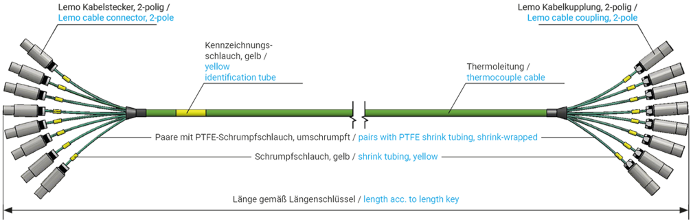 Achieve robust and reliable multi-channel temperature measurement with our 8-channel thermocouple extension cable featuring durable Lemo connectors (FFA/PCA). Built with FEP-insulated, shielded copper wiring, this cable supports a temperature range up to +180 °C and is engineered for high-frequency plug/unplug operations, ensuring long-term mechanical and electrical robustness in multi-channel setups.