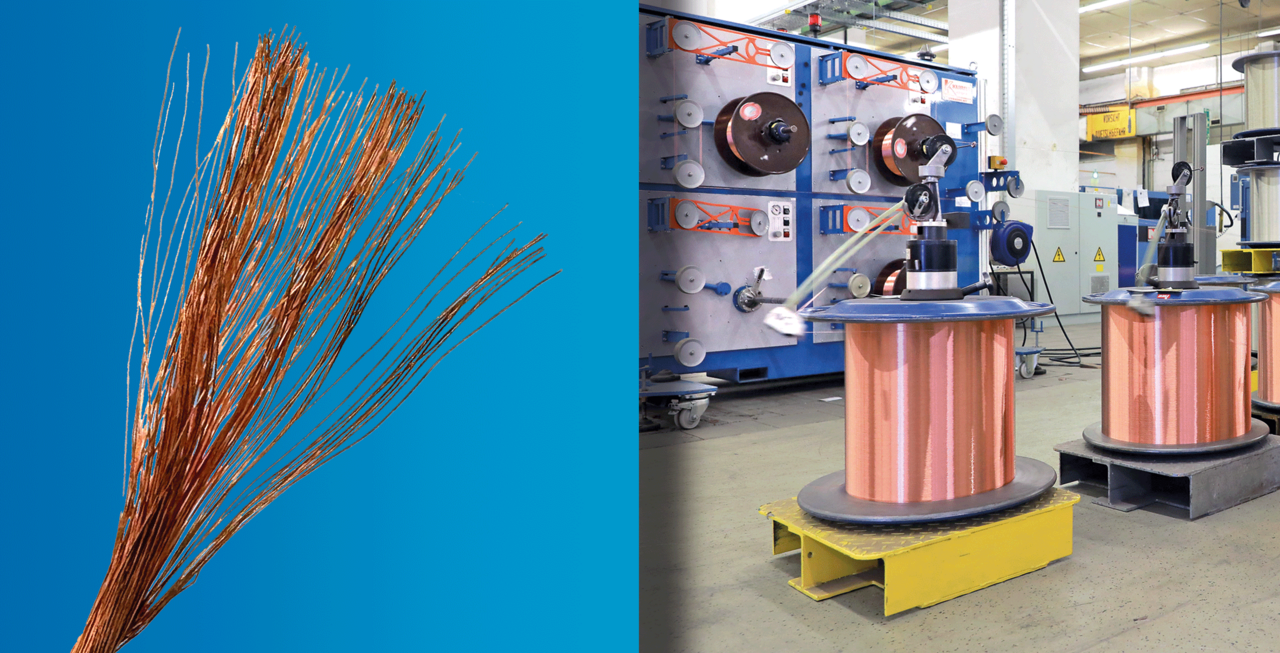 Before a cable can be produced, copper is drawn through several highly precise drawing dies made of exceptionally durable materials such as natural or industrial diamond. By gradually reducing the diameter, extremely fine wires are produced. A cooling and lubricating emulsion protects the wire during the drawing process, while subsequent recrystallization annealing restores its flexibility. This process creates ultra-fine individual wires – the foundation of all flexible cables.